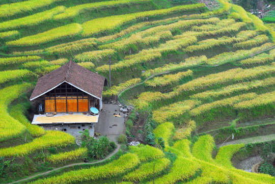紫鵲界梯田位于湖南新化縣西部山區(qū)水車鎮(zhèn),她周邊的梯田達(dá)8萬余畝以上,其地勢之高,規(guī)模之大,形態(tài)之美,堪稱世界之最。 紫鵲界生態(tài)環(huán)境優(yōu)美,梯田密集,形態(tài)原始,阡陌縱橫,線條流暢,山高水長,板屋交錯,充分展示出梯田的自然美、古樸美、形體美、文化美。尤其是隨著四季氣候的變化,使紫鵲界梯田更加婀娜多姿,如臨人間仙境。水奉公路盤旋于這些梯田之間達(dá)十余公里,梯田遍布于海撥500米至1000余米的十幾個山頭上,最大的不過1畝,最小的只能插幾十蔸禾,連綿起伏,輾轉(zhuǎn)盤旋,可謂是儀態(tài)萬方,令人贊嘆不已。