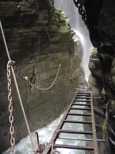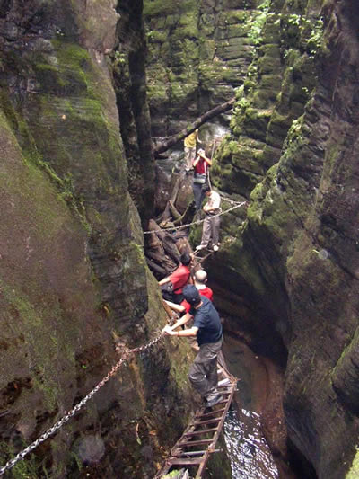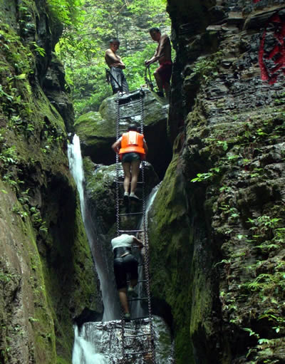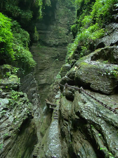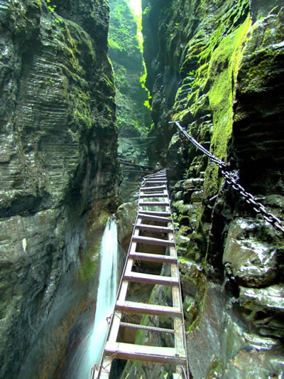 坐龍峽風(fēng)景區(qū) 坐龍峽擁有中國第一條特種游道。所有游道均建于峽谷深處,依山取勢,既經(jīng)細心雕琢聽卻又渾然天成。粗樸的板栗木棧道,可以讓你零距離的親近那一潭碧幽、聽聞山泉叮咚;精巧的跳墩,可以讓你媳戲流泉、觸感溪瀑;原質(zhì)的石坎道,讓你不得不調(diào)動全部的身心能量悉心攀援、感悟峽谷;有驚無險的鐵梯,讓你伴著腳下轟鳴的溪水,在驚怵中體味一份快慰。出口處的土家山寨,保留了古樸獨特的生活習(xí)俗。一塊臘肉就一口醇香的“苞谷燒”會讓你洗去所有的疲憊,在輕松中憨厚的主人向你講述過去強人出沒的故事......