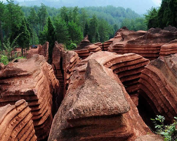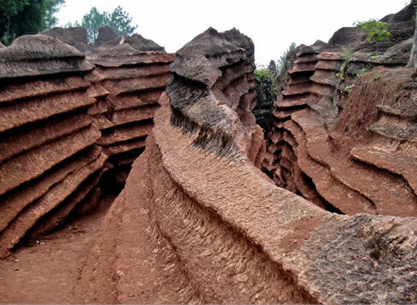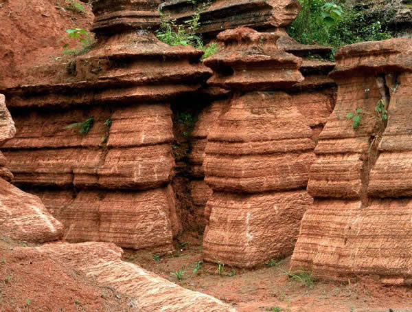紅石林 告別船工后一切便突然安靜下來(lái),過(guò)山谷的小路沒(méi)有人家,偶爾傳來(lái)幾聲清脆的鳥(niǎo)叫。穿過(guò)幾座隘口,峰回路轉(zhuǎn)后“石林”漸漸露臉,石頭的顏色是由灰白到棕紅,變幻而又使人聯(lián)想。間或一棵參天大樹(shù),或是綠竹三兩棵,則又是另一番景致了。于高于低、于肥于瘦的石林,于石于樹(shù)、于濃于淡的色彩,顯得雄奇又雋秀,并透露出一種清靈飄逸。 這些石柱不但顏色各異,而且大小不等。有的高達(dá)七、八米,而有些則像半埋于地下的巨獸骨架。一位村民告訴記者,現(xiàn)在石林沒(méi)有以前壯觀(guān),都長(zhǎng)渣子(灌木)了。原因是由于山頂樹(shù)木減少,雨水將泥土帶下山,很多石頭都被埋在土下,后來(lái)這些地方都開(kāi)墾了農(nóng)田,石林也被永久覆蓋。 由于泥土覆蓋,石林被切割成一個(gè)個(gè)小區(qū)域,有些隱蔽在果林中,而有些則像突然從天而降,散落田間。