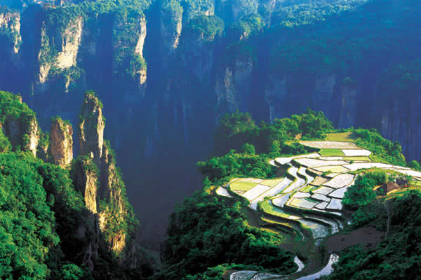 空中田園坐落在天子山莊右側(cè)經(jīng)老虎口、情人路方向兩公里處的土家寨旁,海拔1000余米。它的下面是萬丈深淵的幽 谷,幽谷上有高達(dá)數(shù)百米的懸崖峭壁,峭壁上端是一塊有3公頃大的斜坡梯形良田。田園三方峰巒疊翠,林木參天,白云繚繞,活像一幅氣勢磅礴的山水畫。登上“空中田園”。清風(fēng)拂袖,云霧裹身,如臨仙境,使人有青峰鳴翠鳥,高山響流泉,身在田園里,如上彩云間”之感。