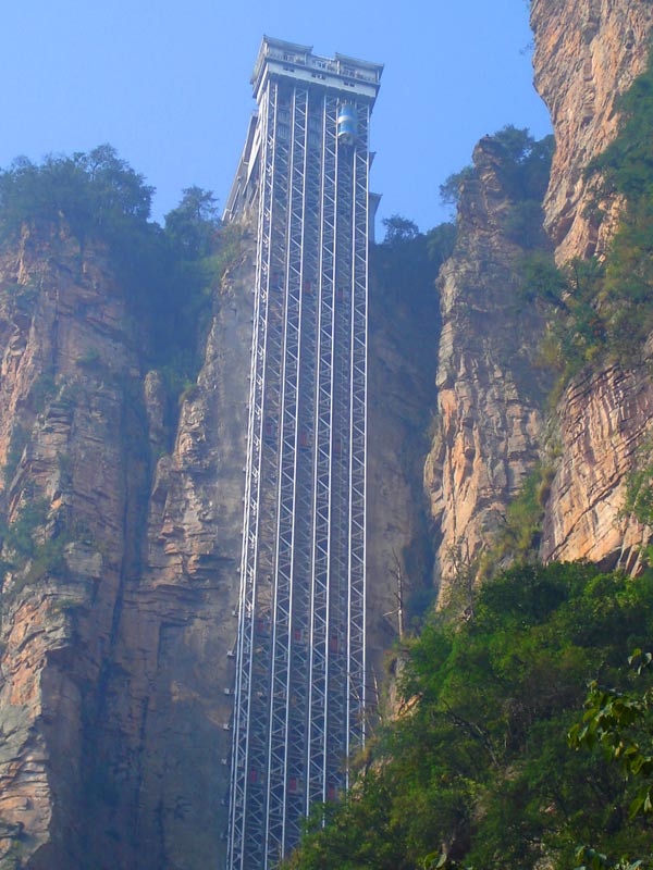 百龍?zhí)焯,垂直高?35米,運(yùn)行高度326米,由154米山體內(nèi)堅(jiān)井和172米貼山鋼結(jié)構(gòu)井架等組成,采用三臺雙層全暴露觀光電梯并列分體運(yùn)行,每臺次載客50人次,運(yùn)行速度3米/秒,三臺同時(shí)運(yùn)行每小時(shí)往返量達(dá)4000人次。百龍?zhí)焯莸男藿▽?shí)現(xiàn)“山上游,山下住”的目標(biāo),提供了交通保障,將袁家界天下第一橋、迷魂臺、天懸白練以及烏龍寨、楊家界等絕世美景從幕后推向了前臺,并將天子山、袁家界、金鞭溪等精品旅游線路連為一體,解決了多年困擾景區(qū)的交通瓶頸問題。