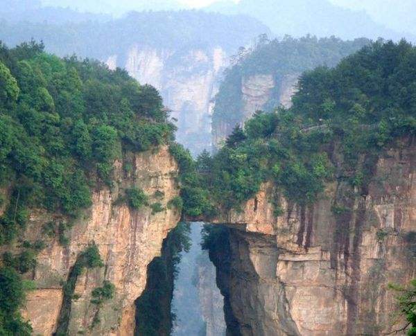 “后花園”至天下第一橋,有一條全長2000多米的游道,路面多為白色的條石鋪成,站在遠(yuǎn)處觀望,很像一條白色的綢帶打了兩個結(jié),一頭系在“迷魂臺”,一頭第在“天下第一橋”。信步漫游,沿途可欣賞到“拜仙臺”、“百丈絕壁”、“小洞天”、“情人谷”等別有情趣的景點(diǎn),這里海拔不高,一般不受氣候影響,慢慢品味,定會使您賞心悅目!疤煜碌谝粯颉笔菑埣医纭笆蠼^景”之一。也是袁家界的標(biāo)志性景點(diǎn),它是居于兩山之間形成的一座天然石橋,而兩山原為一體,橋身是兩山相連的關(guān)鍵部分,但因中間石質(zhì)較為薄弱,由于風(fēng)化、崩塌作用的影響,又經(jīng)過日曬雨淋、流水洗刷、山洪沖擊,久而久之,終于形成今天這一特別的奇景……。自杉刀溝上袁家界,沿絕壁頂部邊緣遨游,至于中坪“觀橋臺” 遙望千米之外,只見一天然石橋凌空飛架兩峰之巔,氣勢磅礴,奇?zhèn)ソ^倫,被稱為“天下第一橋”。石橋?qū)拑H3米,厚5米,跨度約50米,相對高度近400米。天下第一橋與夫妻巖并稱“張家界雙絕”!疤煜碌谝粯颉睒蛎鎸拑擅,厚四米,跨度為二十多米,高度為三百多米,是世界是迄今為止所發(fā)現(xiàn)落差最高的天然石橋。