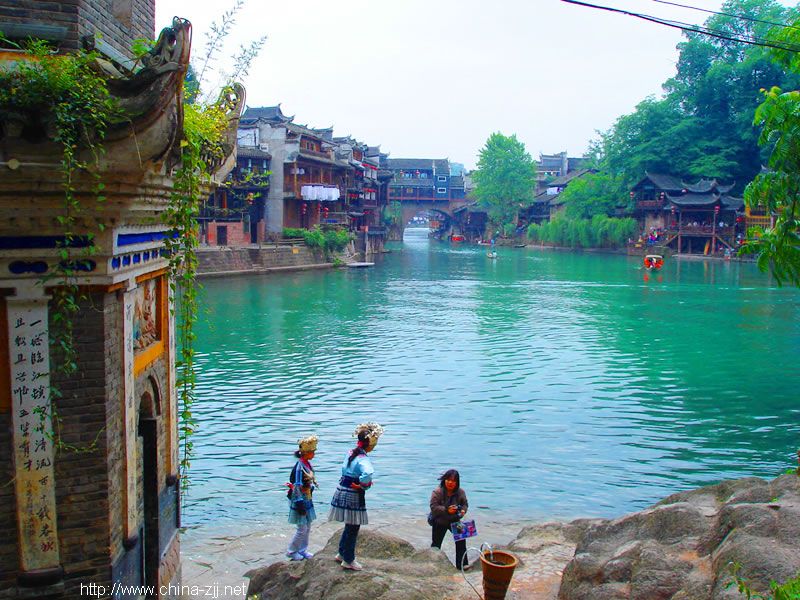 【鳳凰古城位于沱江之畔、群山環(huán)抱、關(guān)隘雄奇、碧綠的沱江依著城墻緩緩流淌,疊翠的南華山麓倒映江中,江中漁舟游船數(shù)點(diǎn),山間暮鼓晨鐘兼鳴,懸崖上的吊腳樓輕煙裊裊,碼頭邊的浣紗姑笑聲朗朗,兩岸已有數(shù)百年歷史的吊腳樓更是別有一番風(fēng)味;順?biāo)麓┻^(guò)虹橋一幅江南水鄉(xiāng)的畫面便展現(xiàn)于眼前--萬(wàn)壽宮、萬(wàn)名塔、奪翠樓……一種遠(yuǎn)離塵世的感覺(jué)悠然而生;鳳凰--猶如“一幅濃墨淺彩的中國(guó)山水畫”】